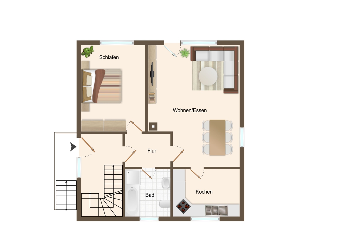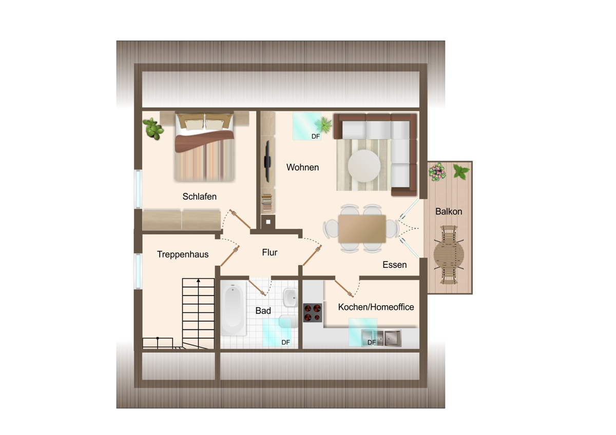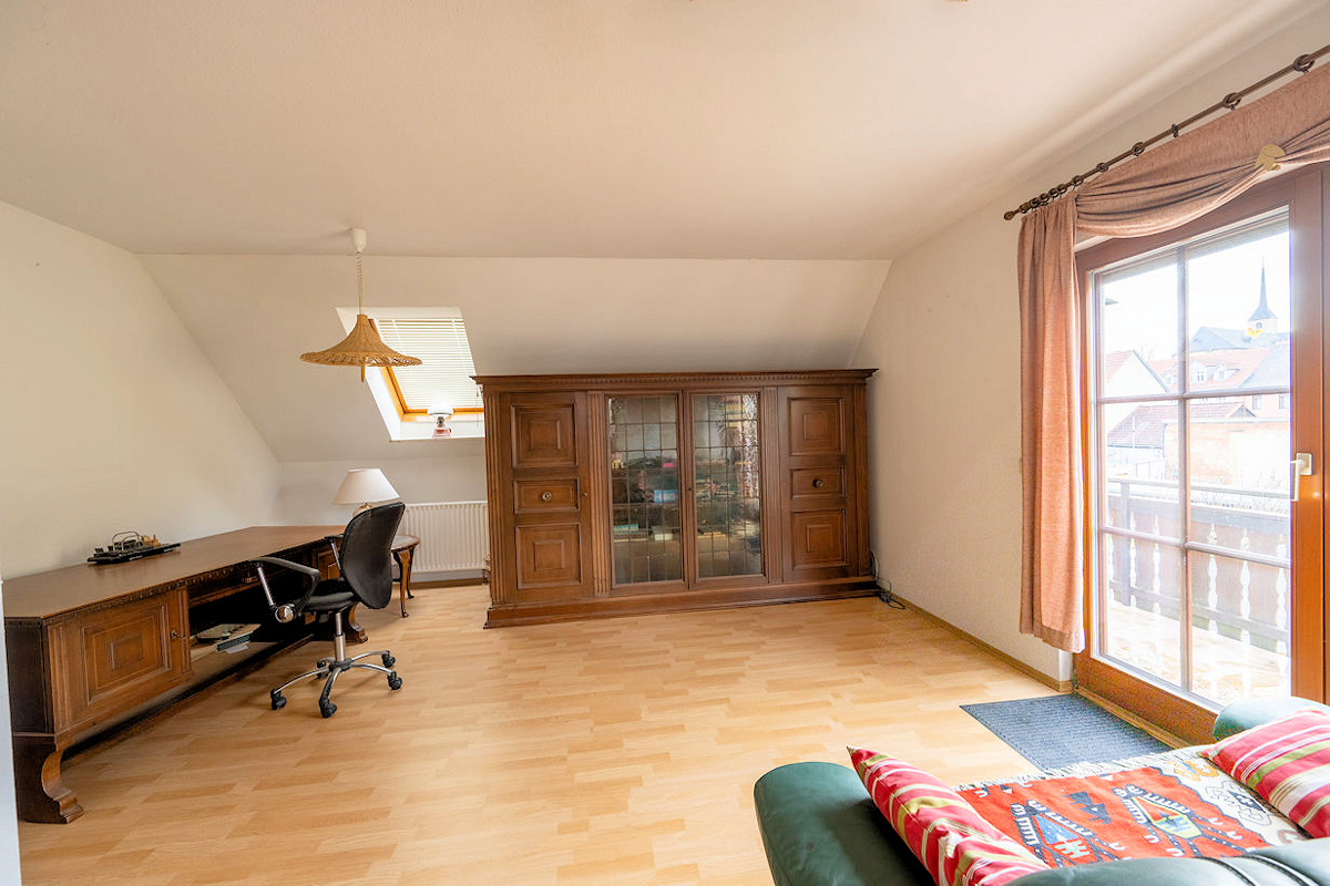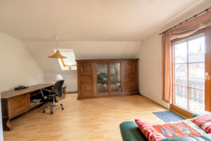 Das Dachgeschoss verfügt über ein weiteres Schlafzimmer sowie ein großzügiges Wohnzimmer mit direktem Zugang zur Küche und Zugang zum Balkon. Dieser Raum kann alternativ auch hervorragend als Schlafzimmer mit integriertem Ankleidebereich genutzt werden. Ergänzt wird diese Etage durch ein Duschbad.